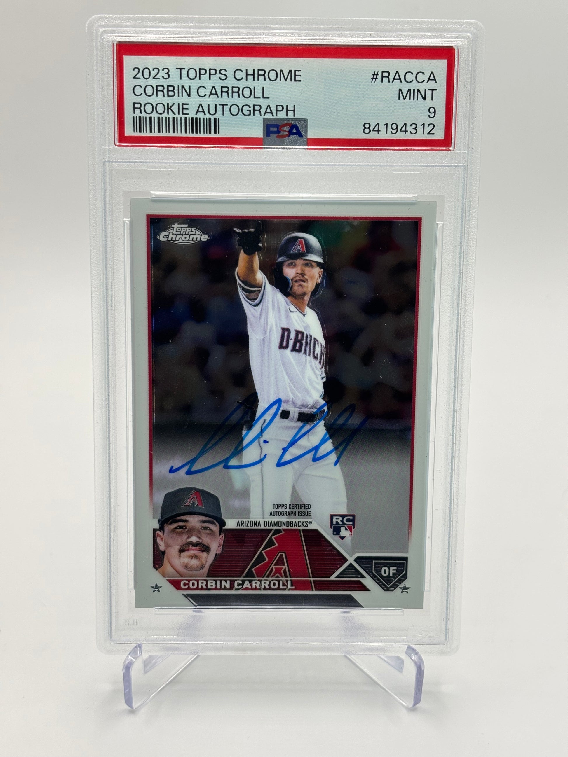 The Corbin Carroll 2023 Topps Chrome Rookie Card with autograph graded PSA 9 is a premium collectible for serious baseball enthusiasts. Featuring Carroll’s signature on a high-quality chrome card, this rookie card combines visual appeal with investment potential. Its PSA 9 grade ensures near-mint condition, making it a valuable addition to any advanced sports memorabilia collection. Ideal for collectors focused on rising stars and authenticated autographs, this card represents both a key piece of 2023 baseball history and a promising asset for the future.