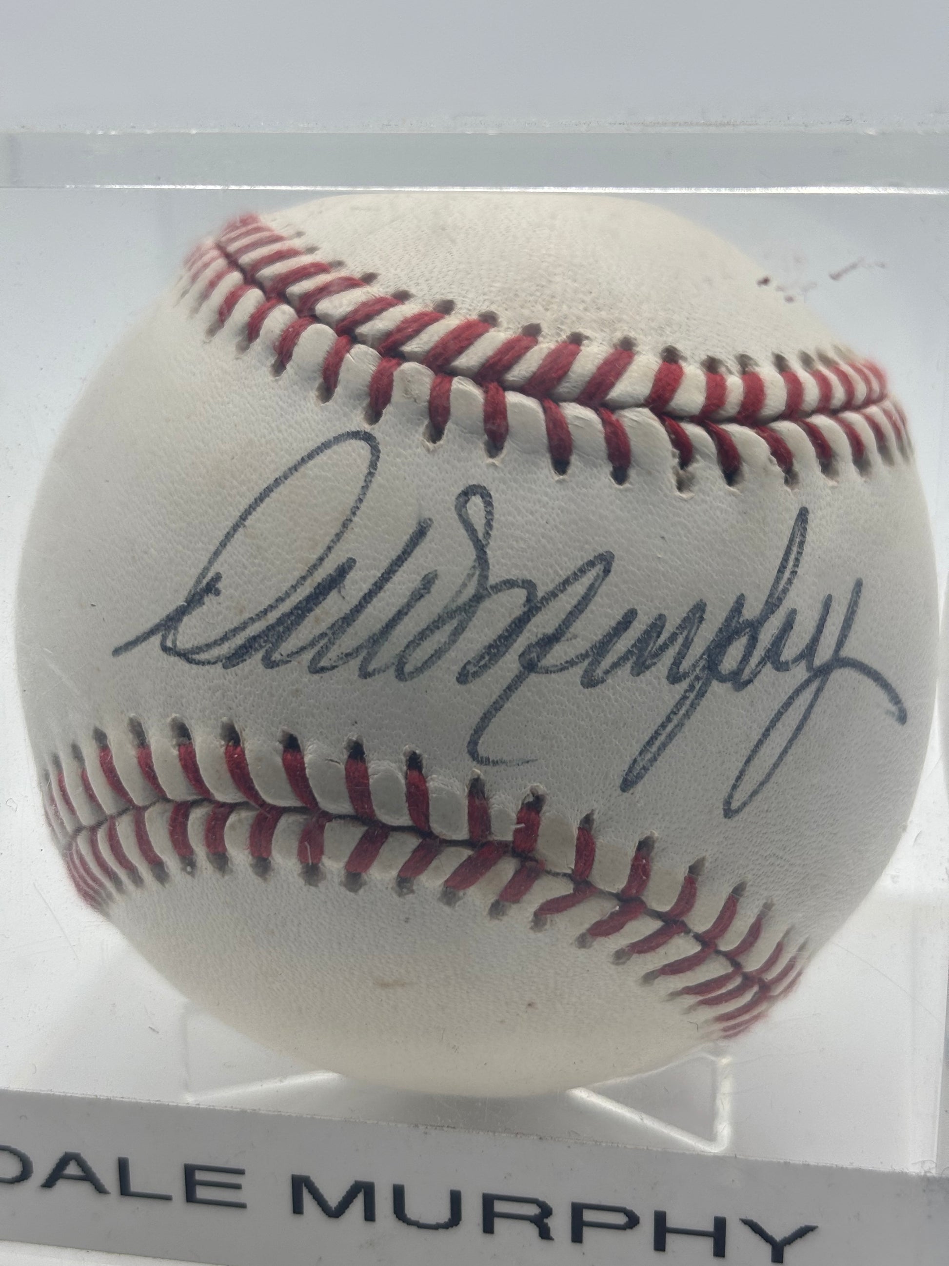 Celebrate the legacy of Dale Murphy with this autographed baseball, a prized collectible for any serious sports enthusiast. Murphy, a two-time National League MVP and seven-time All-Star, was renowned for his power hitting and exceptional defense during his Major League Baseball career. With over 400 home runs and more than 1,200 RBIs, his achievements highlight a remarkable era in baseball history. This signed baseball captures the essence of a player who left an indelible mark on the game, making it a valuable addition to any collection.