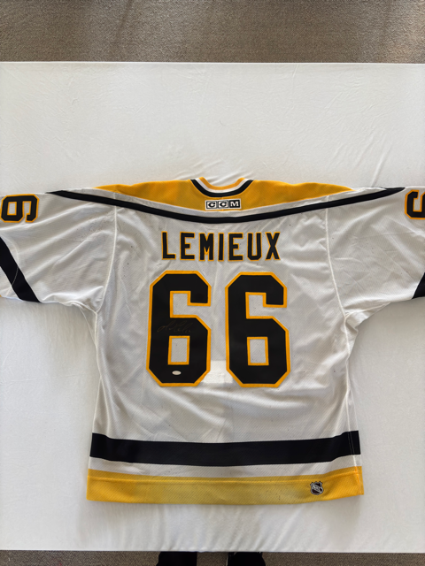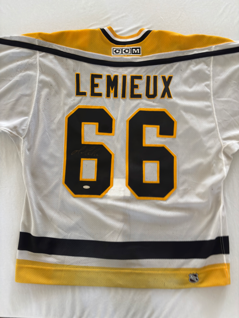 This Mario Lemieux autographed Penguins jersey offers a rare piece of hockey history, potentially game-worn as indicated by its authentic wear and marks. Featuring Lemieux’s signature, it combines collectible value with the tangible connection to one of the sport’s greatest players. Ideal for serious collectors, this jersey embodies both provenance and prestige, making it a standout addition to any hockey memorabilia collection.