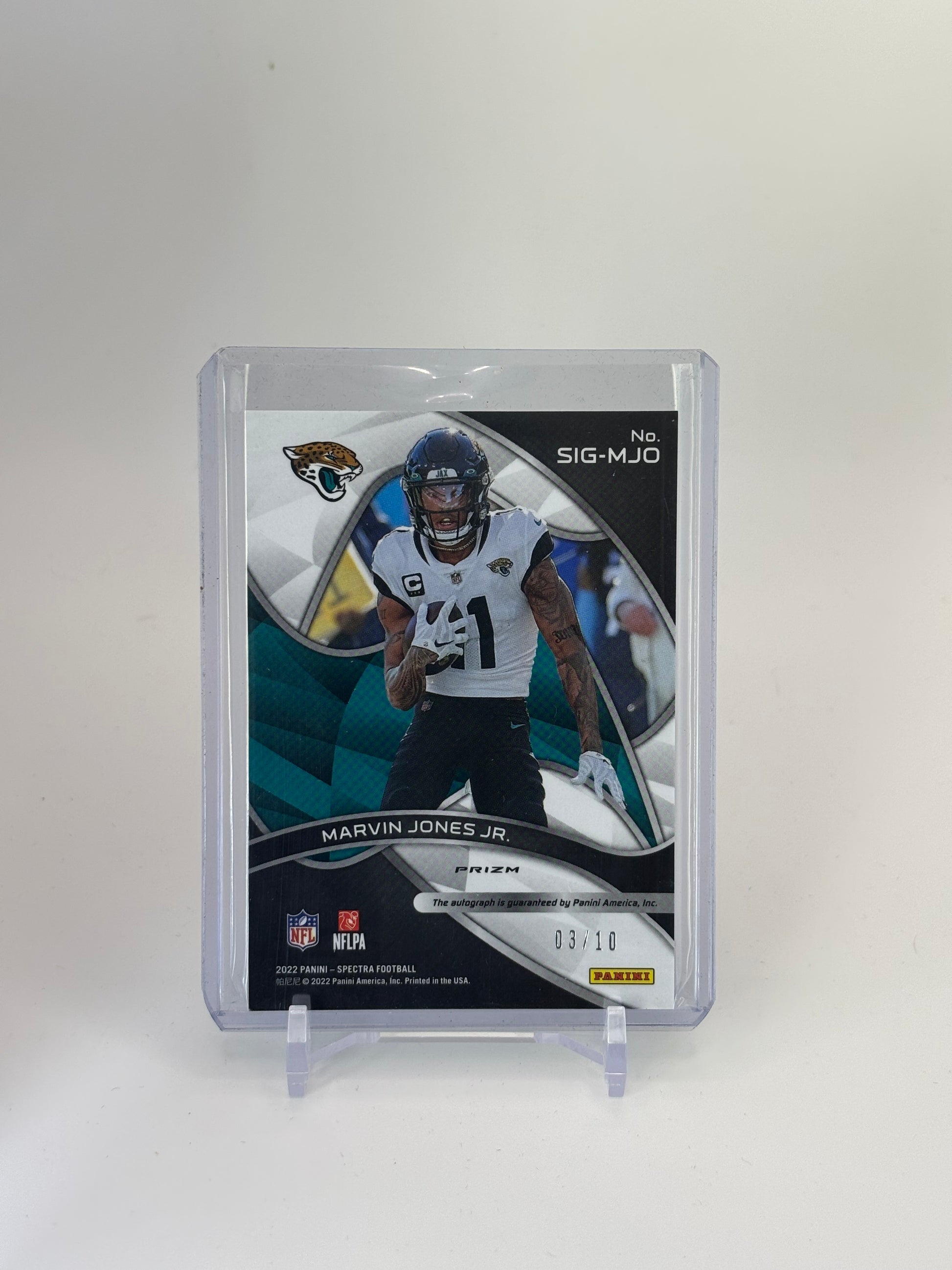 Marvin Jones Jr. 2022 Spectra Signatures Neon Orange #3/10 is a limited-edition collectible highlighting the career of a wide receiver known for consistent production and reliable hands. Since entering the NFL in 2012, Jones has accumulated over 6,000 receiving yards and more than 45 touchdowns, showcasing his ability to be a key offensive weapon. This Neon Orange edition, numbered 3 of only 10, captures Jones’s impact on the field with vibrant design and authenticated autograph, making it a prized piece for serious collectors appreciating both performance and rarity.