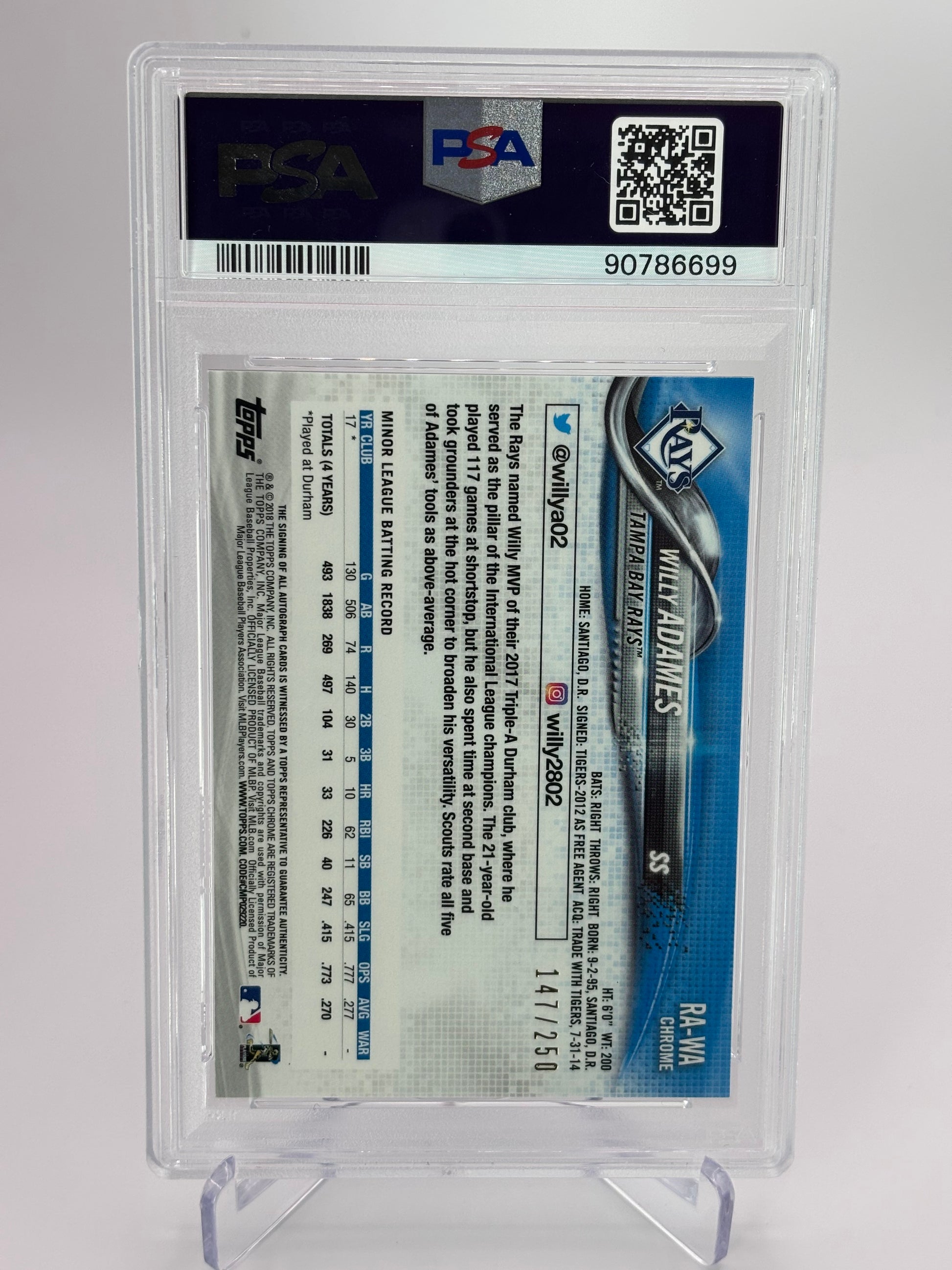 Willy Adames 2018 Topps Chrome Purple Refractor Auto RC #147/250 PSA 8